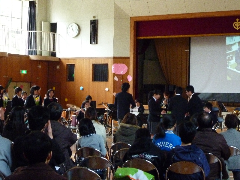 新学期からは、被災地の中学生も何人か編入学するようですが、是非、音楽やスポーツを通じて交流が出来ることを望んでやみません。新しい環境での不安はいっぱいあるでしょうが、ひと時でも安らぎを感じる空間を共有できたらと願うばかりです。古里中生の力に期待します。